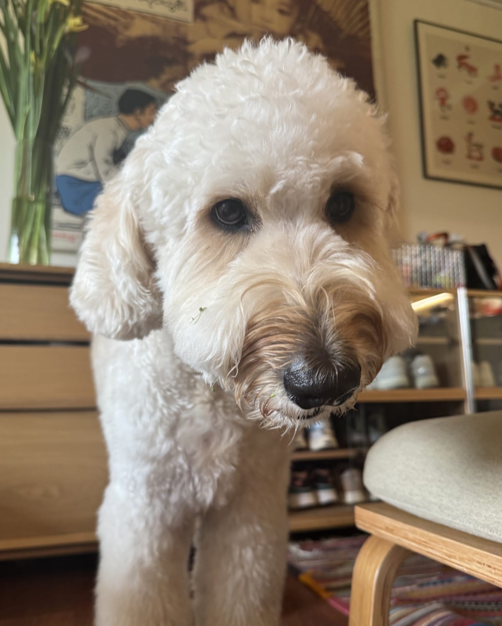 Named after phyllotaxis — the golden-angle spiral in sunflower seeds. Photos and text bloom outward from center. A constraint solver guarantees zero overlap.